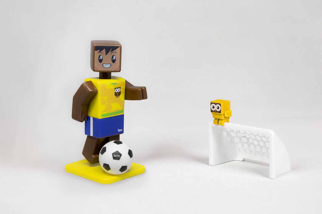O Brinquedo Interativo Acorda Coruja - Amarelo é composto por um jogador de futebol, uma goleira, uma bola e uma coruja. Este jogador é destro, chuta com a perna direita.